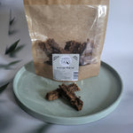 Een knapperig tussendoortje gemaakt van makreel, kabeljauw en algen.  Analyse   Ruw eiwit 59,1%, Ruw vet 8,4%, Ruwe As 4,4%, Ruwe Celstof 0,5%, Vocht 7,5% Hypo-Allergeen  Inhoud 100 gram